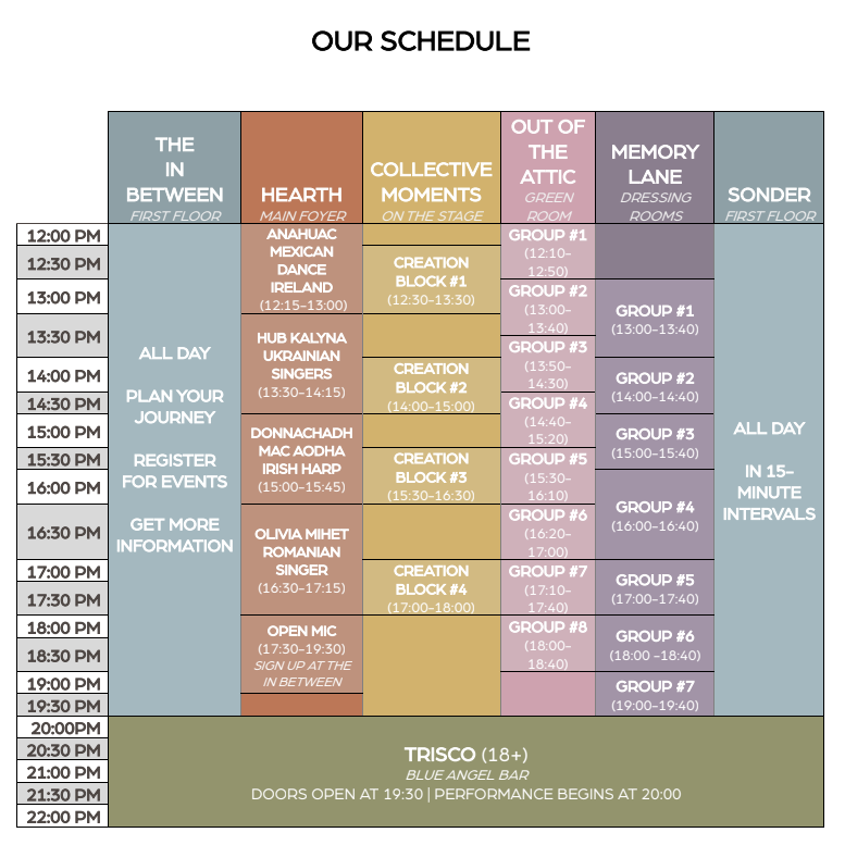 Retrospect Arts Festival is committed to transparency in our accessibility practices. Hearth, Out of the Attic, Trisco, and the In Between are fully wheelchair accessible. Collective Moments is wheelchair accessible via an usher-operated stair lift, which will be available and staffed between 12pm and 7pm. Memory Lane is not wheelchair accessible and is accessed via a flight and a half of stairs; a video experience will be available in the In Between section of the Festival.